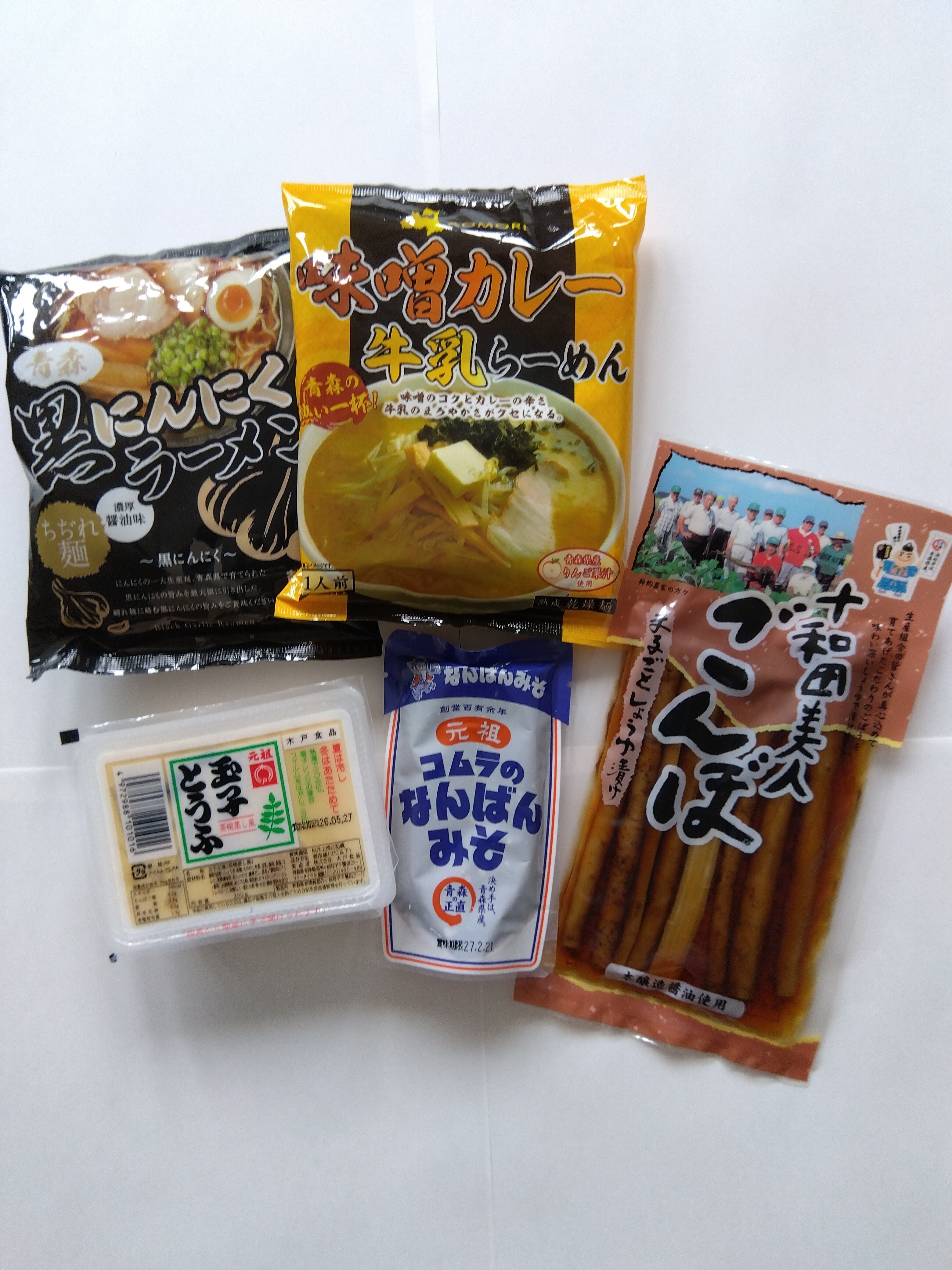 素朴で力強い味わいのなんばんみそ、シャキッと香り高いごぼうの漬物、つるりと優しい卵豆腐、海の旨みが濃厚なうにめかぶ、南部せんべいを使った人気菓子チョコQ助、地元牛乳と味噌のコクがクセになる牛乳味噌カレーラーメン、そして青森名物の滋味深い黒ニンニクラーメン。